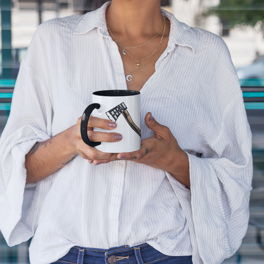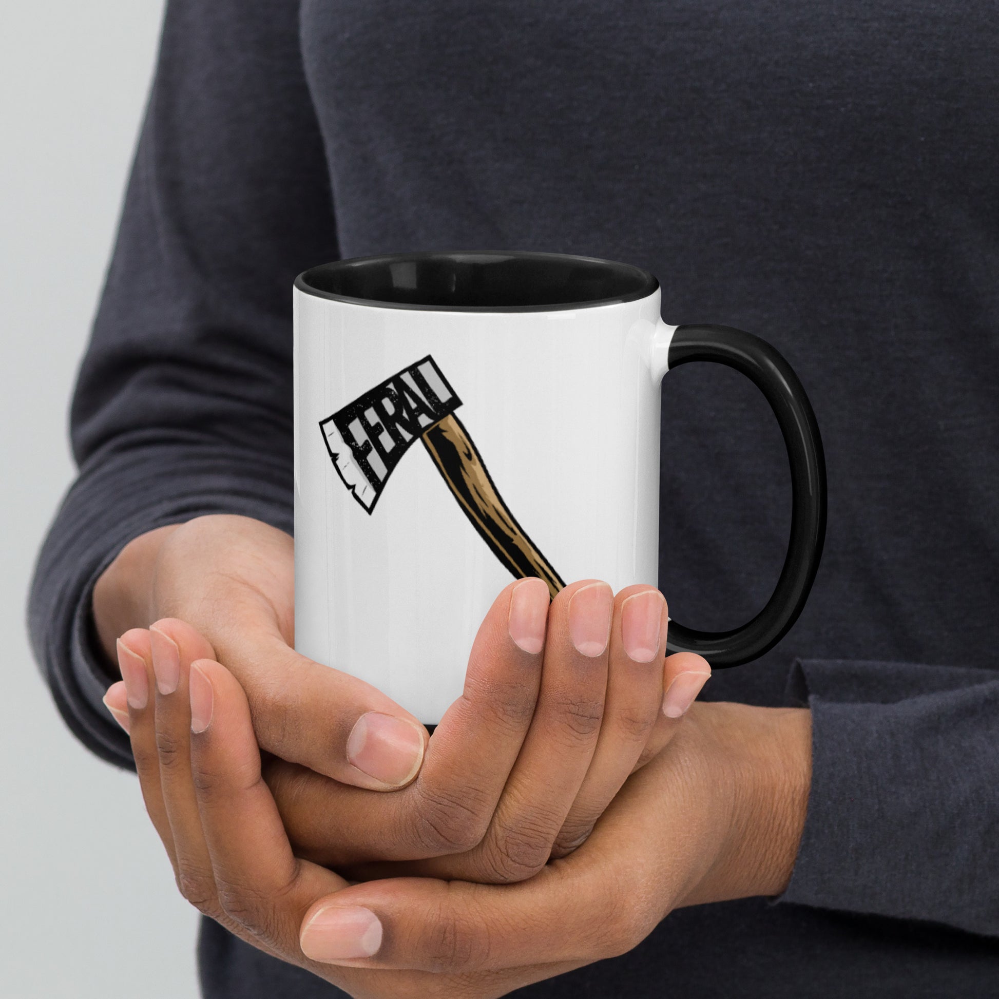 It is a ceramic mug to hold your tasty beverages with a FERAL ax printed on it. The inside and handle are black to help hide the dirt, we mean drink rings, in case your day gets exciting and washing isn't on the agenda. Need we say more?