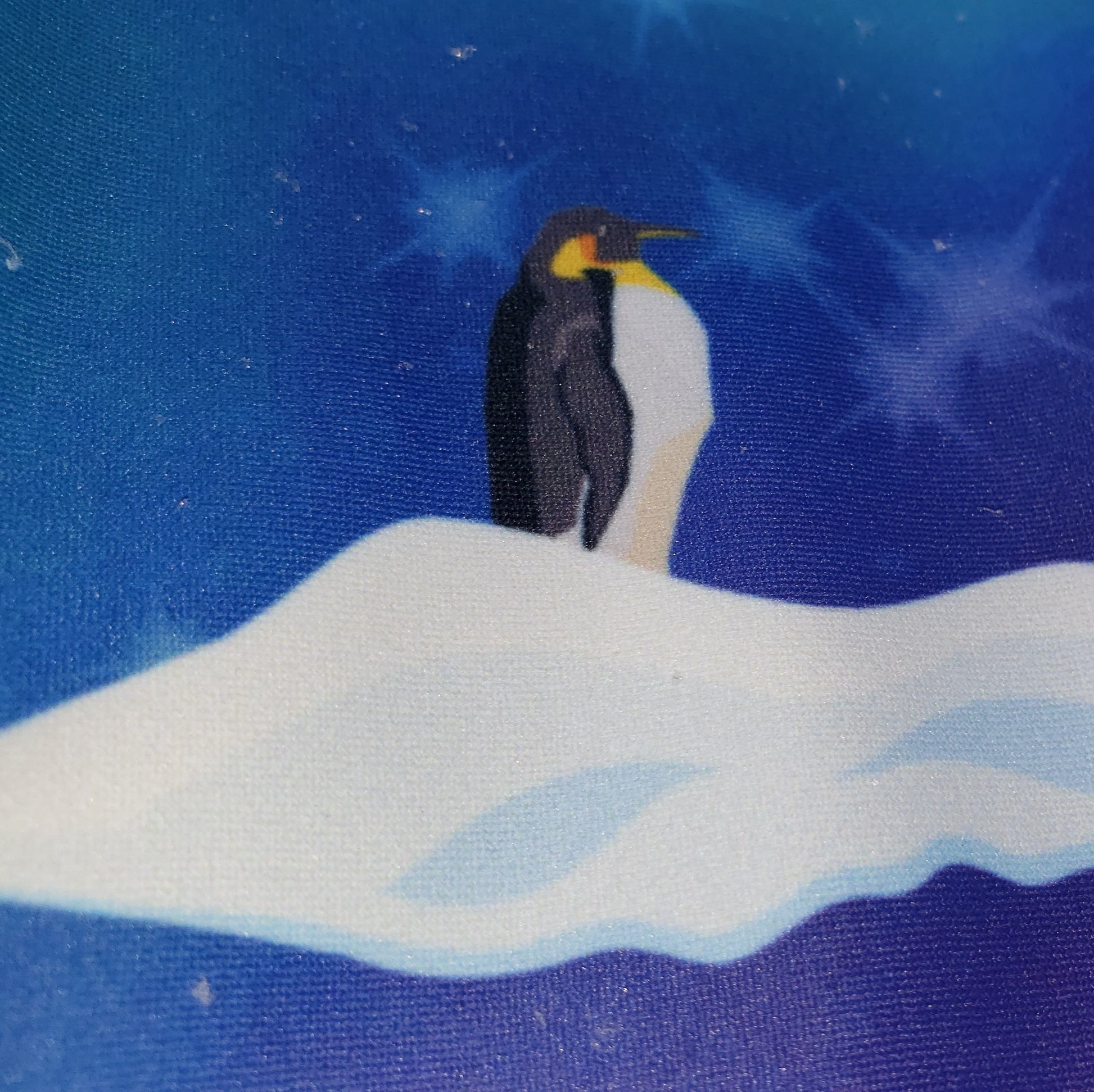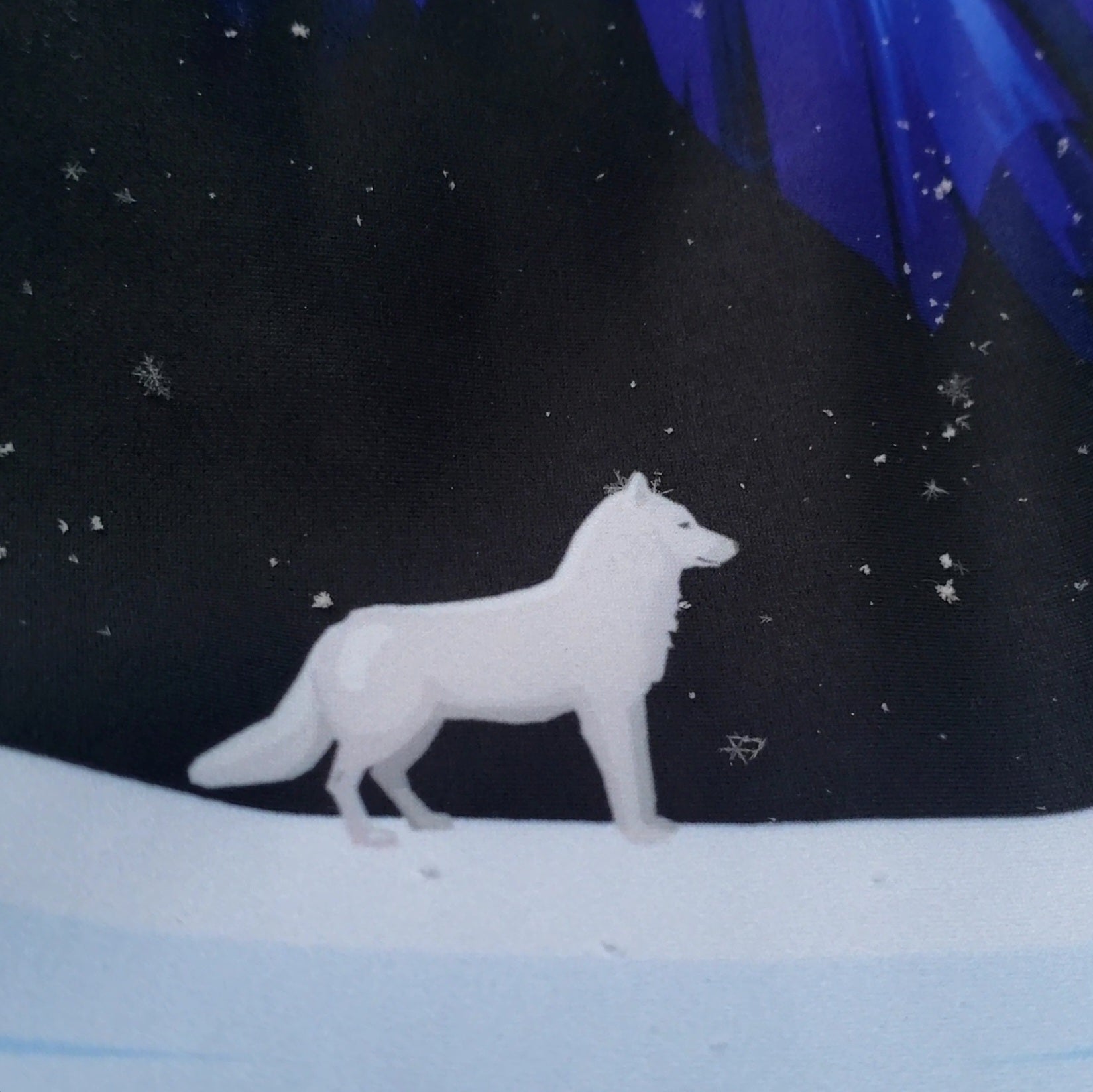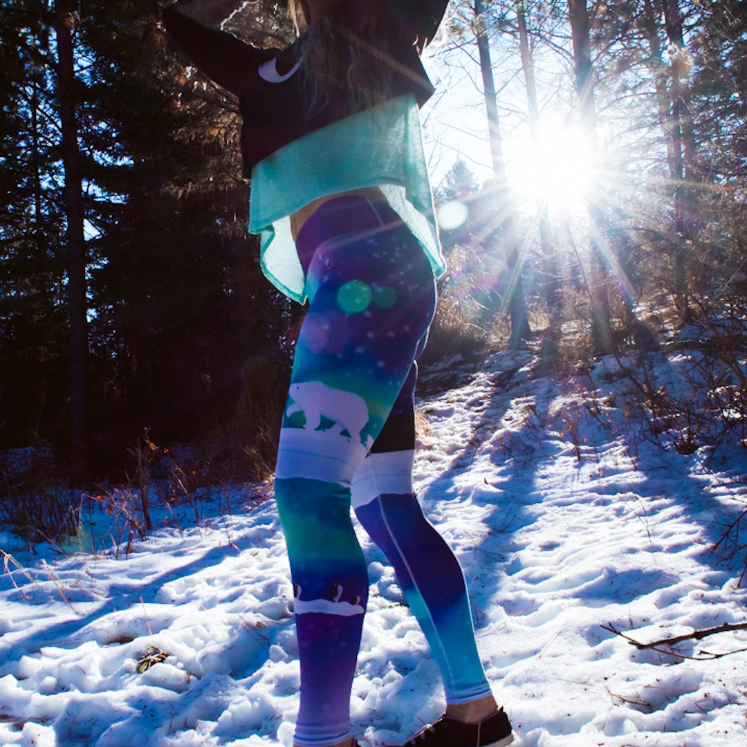 In the arctic the living is hard but the landscape is beautiful.  The Limited Release Arctic Sky Leggings features critters that thrive in such harsh climates. The design features a polar bear mamma with two cubs, three penguins, a seal pup plus an arctic fox all dancing within the snowing landscape and the northern lights.