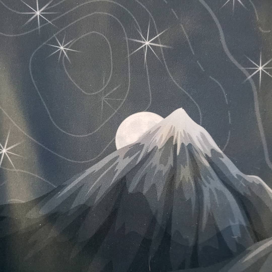 To honor legends of the American landscape. We owe it all to the Bison, their sacrifice gave way to the world we are enjoying today. This design features a herd of Bison and their trusty Magpie bird friends on a landscape where the mountains meet the plains. The moon rises high behind the majestic peaks dancing with the stars, in a blue-grey sky that twinkles with topography.