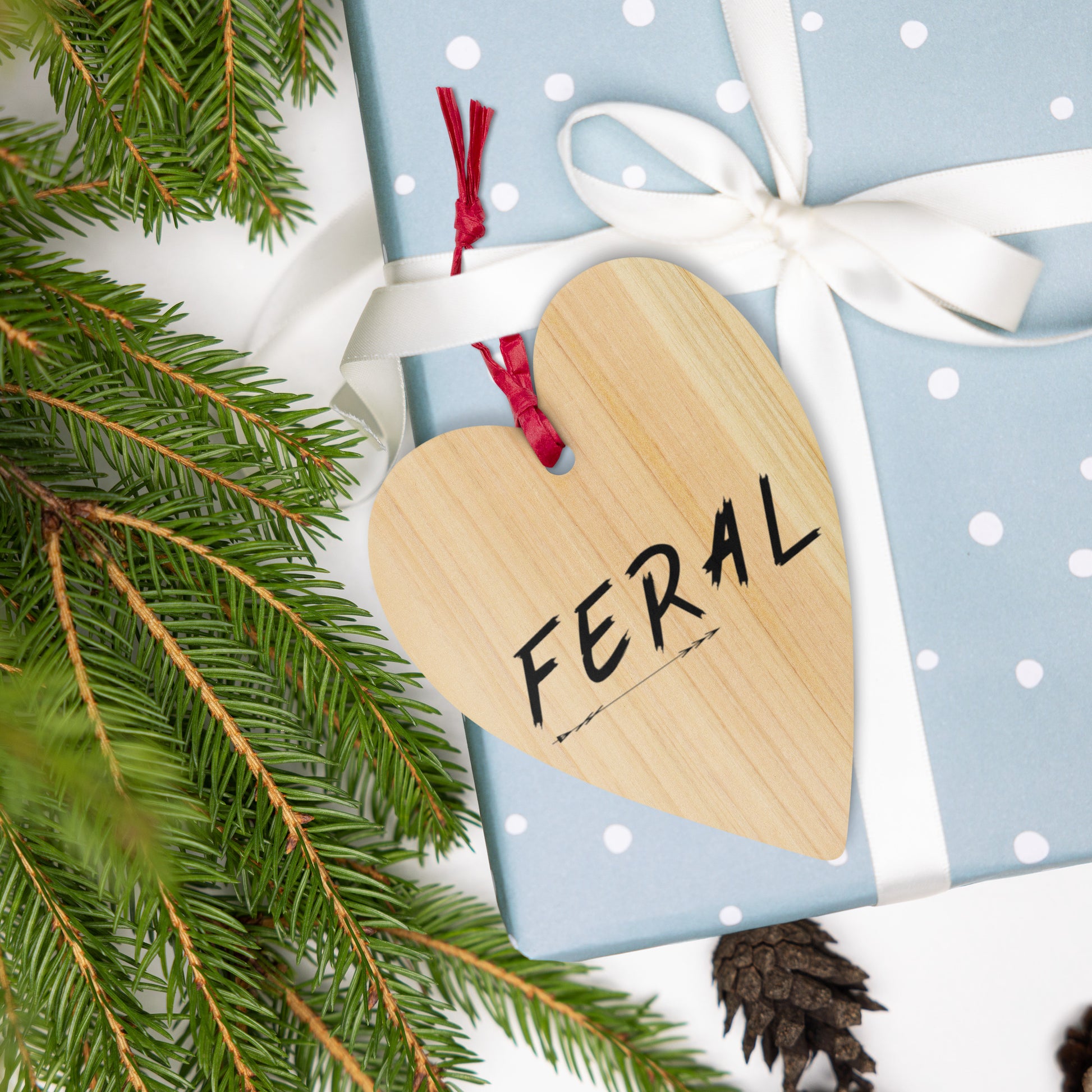 Add a little Feral to your home or gift with these wooden ornaments. Made from Hinoki wood, they are durable and high quality with a rad print.